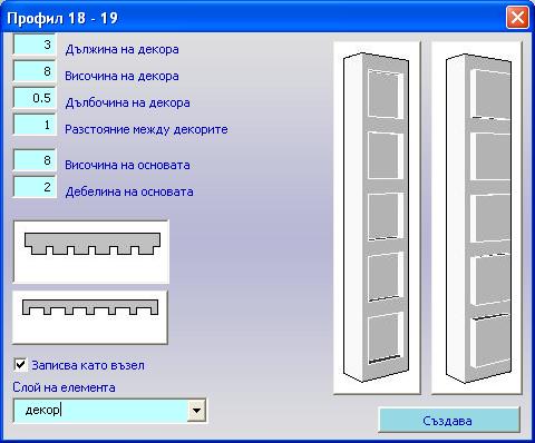 между декорите). Основни опции и параметри във формите:Височина на основата, Дебелина на основата - под "основа" се има впредвид основата, която се използва за изрязване на отвори в нея. Записва