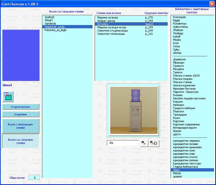За да адресирате палитра към слой трябва да посочите в активния списък съответен възел. Изберете библиотека с двойно кликане върху името и в списъка Библиотеки с оцветяващи палитри.Свързването на слоевете с палитри се извършва по същият начин както в Библиотеки с палитри. За палитрите от библиотеки Glass и Metals се прилагат свойствата, установени в Библиотеки с палитри---> Библиотеки --->Параметри на потребителски библиотеки с палитри. За всички останали палитри се прилагат свойствата им по подразбиране.